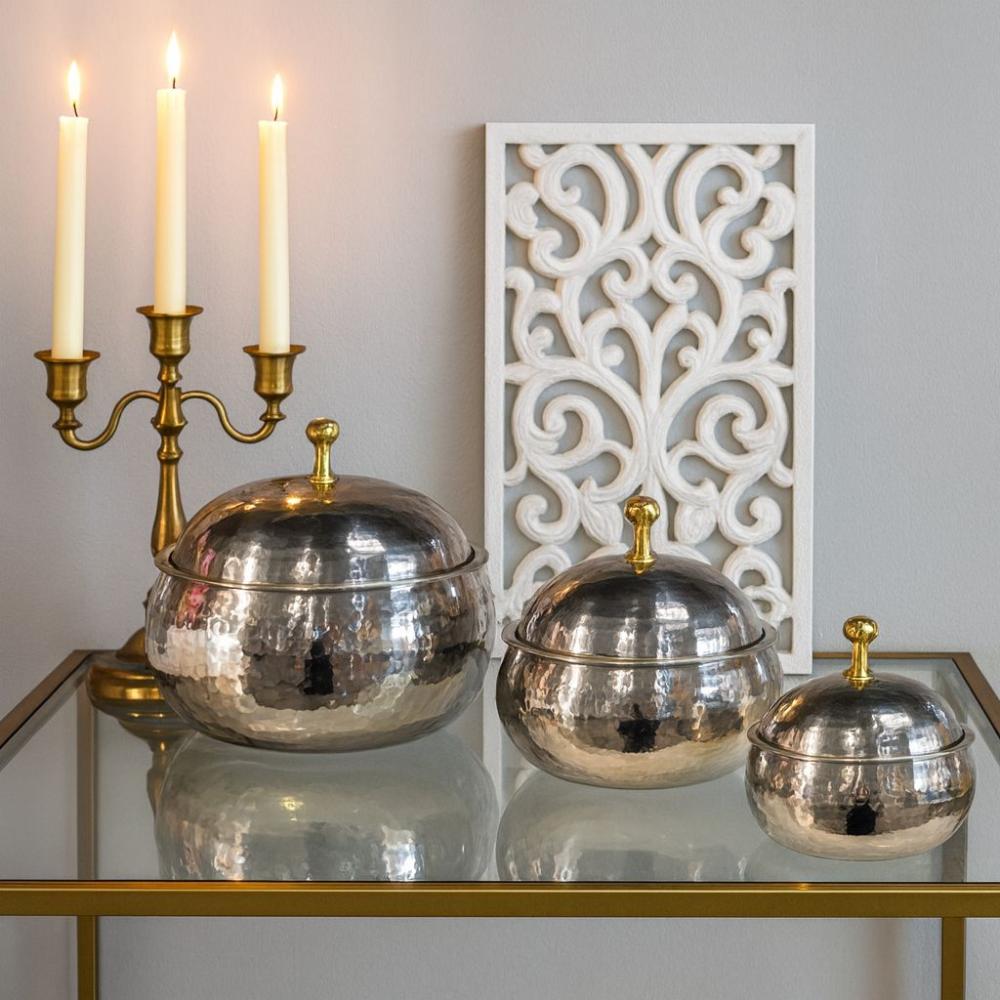 أضف لمسة من الفخامة لمائدتك مع حافظات الطعام اليدوية الهندية المصنوعة بعناية من معدن مطرّق بلمعة أنيقة، وأغطية مزينة بمقابض ذهبية تضفي طابعاً راقياً.