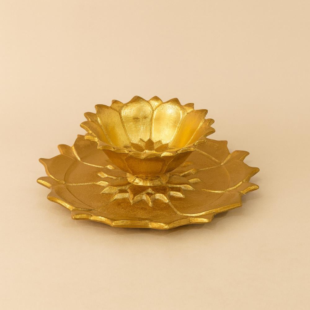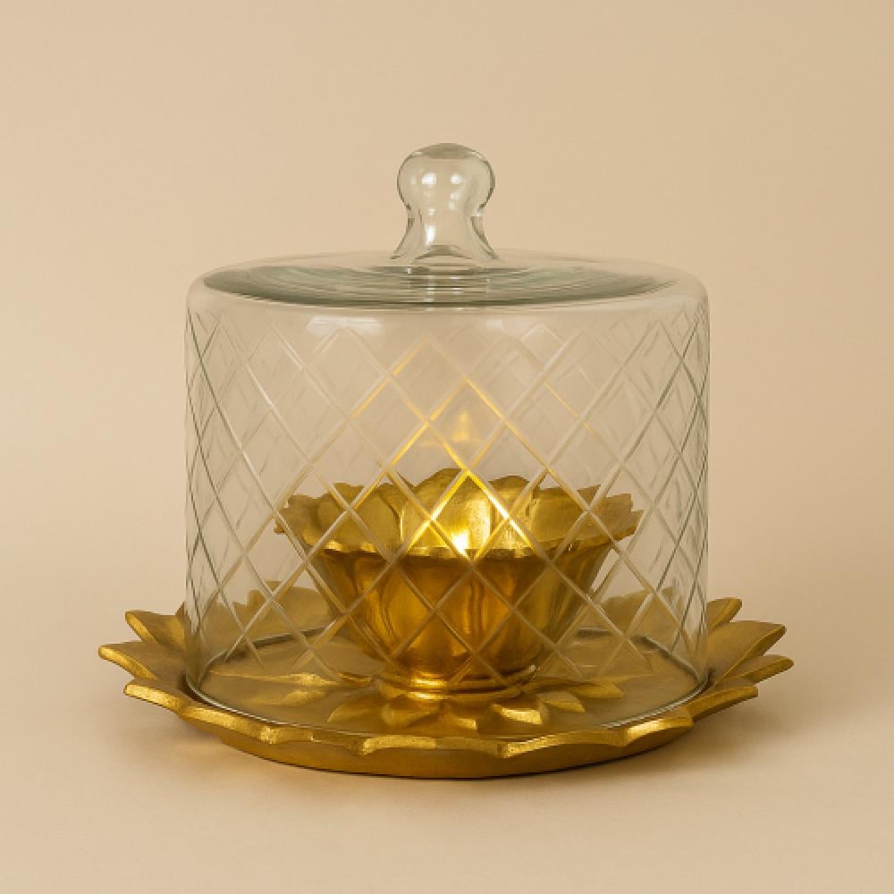 تصميم أنيق على شكل زهرة اللوتس مع قاعدة متناسقة من المعدن الذهبي اللامع وغطاء زجاجي محفور بتفاصيل فاخرة تضيف لمسة راقية لديكور الطاولات والمجالس.