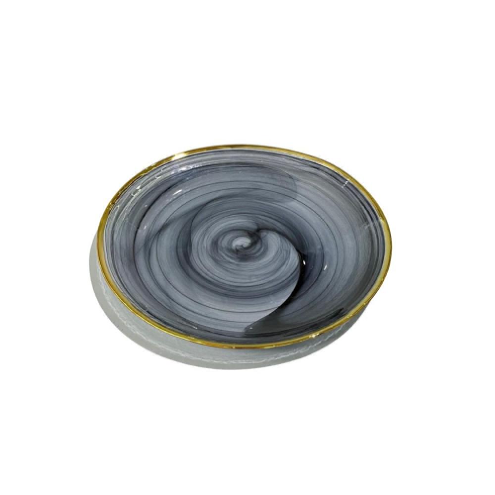 صحن فاخر مصنوع من زجاج عالي الجودة بتصميم رخامي أنيق باللون الرمادي المورخاني، مزين بحافة ذهبية لامعة تضفي لمسة فاخرة على مائدتك. مثالي لتقديم الأطباق أو الحلويات في المناسبات الخاصة.