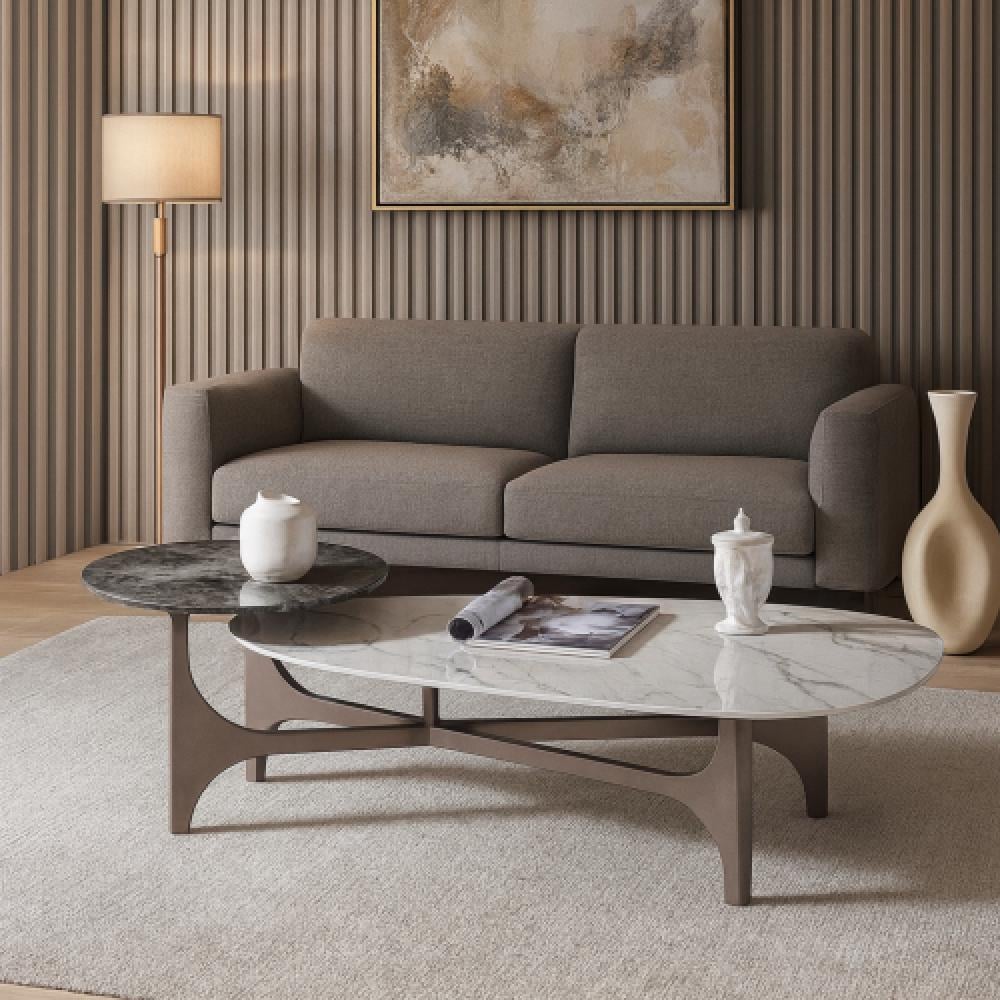 طاولة وسط أنيقة بطبقتين من الرخام الطبيعي الأبيض والأسود، بتصميم عصري يجمع بين الفخامة والبساطة. القاعدة المعدنية تمنحها ثباتًا وأناقة مثالية لغرف المعيشة الحديثة.