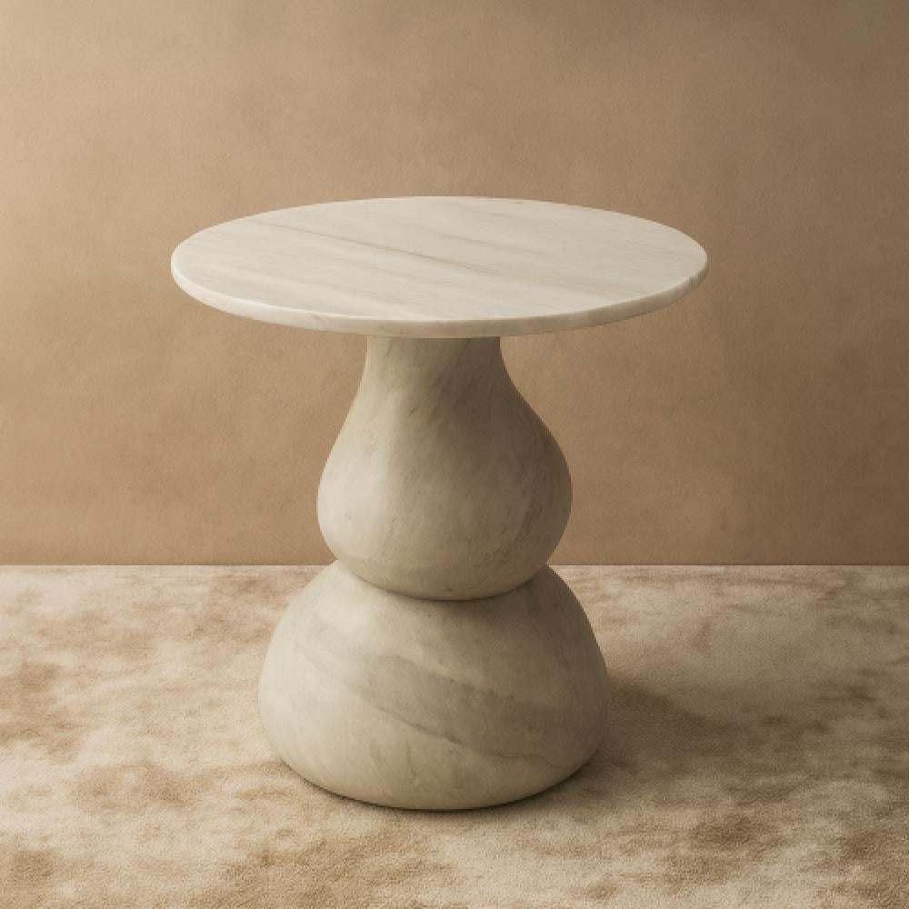 طاولة جانبية بتصميم عصري فاخر، مصنوعة من الرخام الفاخر بلون بيج هادئ يبرز تفاصيل العروق الجميلة.