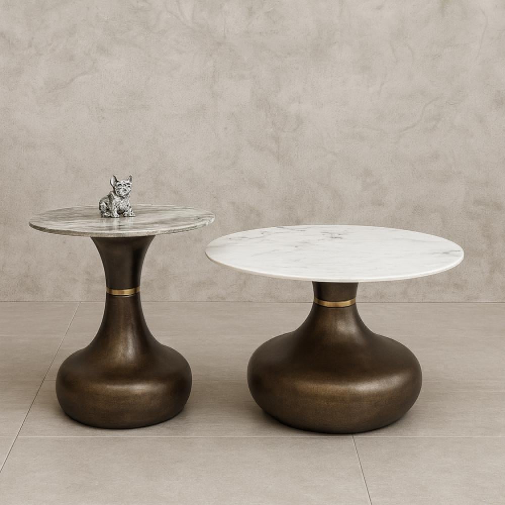 طقم طاولات جانبية أنيقة بتصميم عصري، بسطح رخامي فاخر وقاعدة معدنية بلون برونزي مطفي، يضفي لمسة فخامة على غرف المعيشة أو الجلوس.