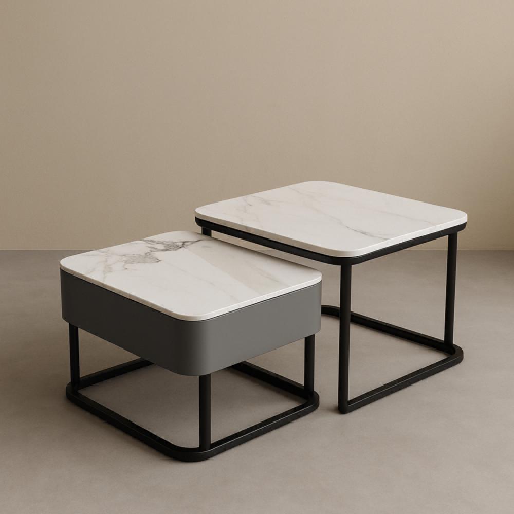 طقم طاولات قهوة عصري مكوّن من قطعتين بتصميم أنيق، أسطح رخامية فاخرة بإطار معدني أسود متين، يضفي لمسة فخمة وعصرية على أي غرفة معيشة.