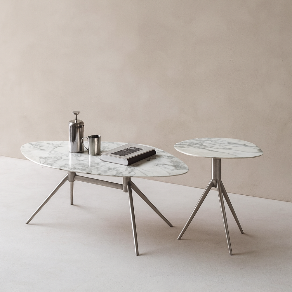 طقم أنيق بسطح رخامي أبيض وقواعد معدنية فضية، يضفي لمسة فخمة وعصرية على ديكور المجلس أو غرفة المعيشة.
