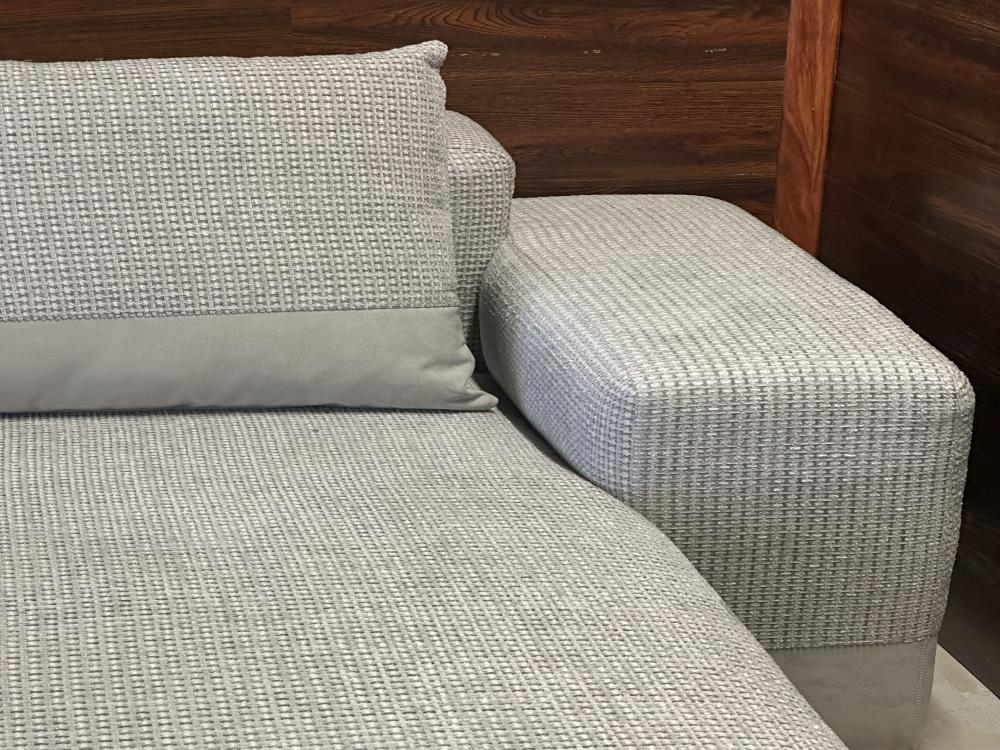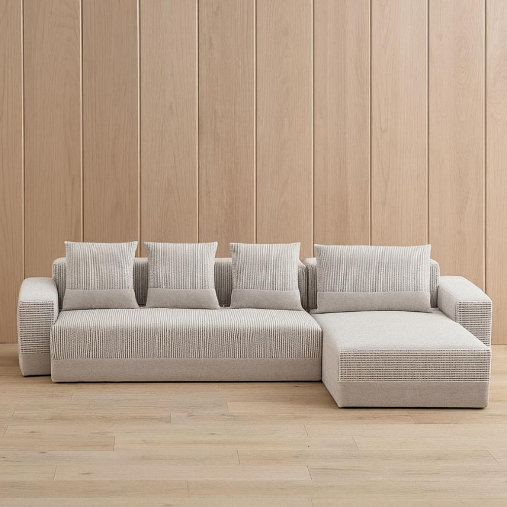 كنب عصري أنيق تكفي حتى ٤ أشخاص مع شيزلونج ( chaise longue ) للراحة والاسترخاء. مصنوعة من قماش عالي الجودة بلون رمادي فاتح، مع قاعدة خشب متين.