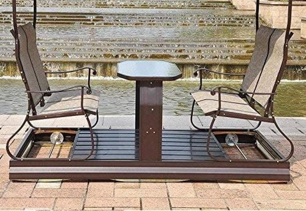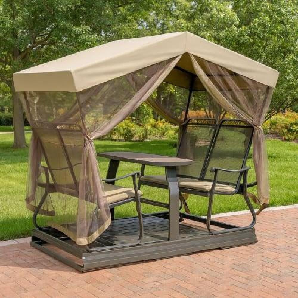 مظلة حديقة متكاملة مع قاعدة متحركة تعمل مثل الأرجوحة، مصنوعة من هيكل معدني قوي مقاوم للصدأ مع طاولة وسطية ثابتة. تتميز بمقاعد مريحة تتحرك بانسيابية للأمام والخلف لتعطي إحساس الاسترخاء مثل الأرجوحة، بالإضافة إلى مظلة علوية قماشية باللون البيج للحماية من الشمس، وشبك شفاف محيط لحماية مثالية من الحشرات مع إمكانية فتحه وإغلاقه بسهولة. تصميم عملي وأنيق يضفي على الجلسة أجواء مريحة وممتعة للحدائق والاستراحات.